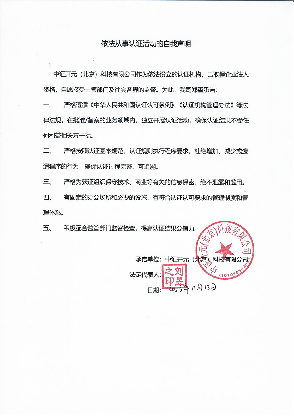 依法从事认证活动的自我声明